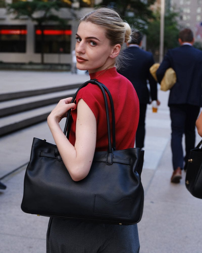 OLEADA NYC Tote Bag > Leather Tote Bag For Women > Mini Handbag > Convertible To Shoulder Bag > Fits 14" laptop> Color_Onyx Marina Tote